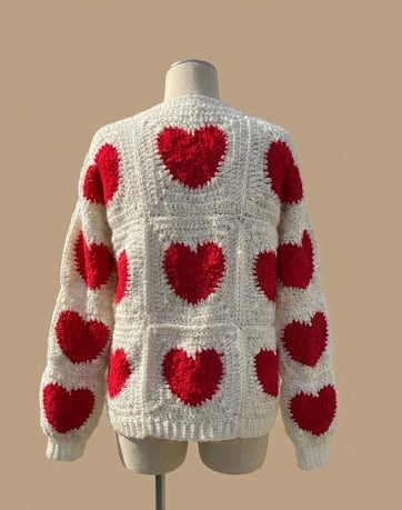 Wrap yourself in love with this statement cardigan. Featuring bold red hearts set against a creamy white background, this piece is the perfect blend of cozy and cute. The open-front design makes it easy to layer over any outfit, while the ribbed cuffs and hem add a polished, comfortable finish. It’s heavy enough to keep you warm, but breathable enough for all-day wear.